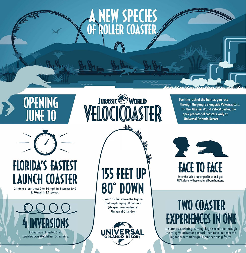 Since I have last been to Universal Studios Orlando two main attractions have been added to the resorts already long list of top notch thrill rides. On the top of my "must do" list is the VelociCoaster. Located in the Jurassic World area of Islands of Adventure, this attraction tops out at 70mph of twists, turns, barrel rolls, and upside down loops, all while guests are trying not to get their heads eaten by velociraptors. Fun fact: this ride has no brakes until the very end (scared face emoji).